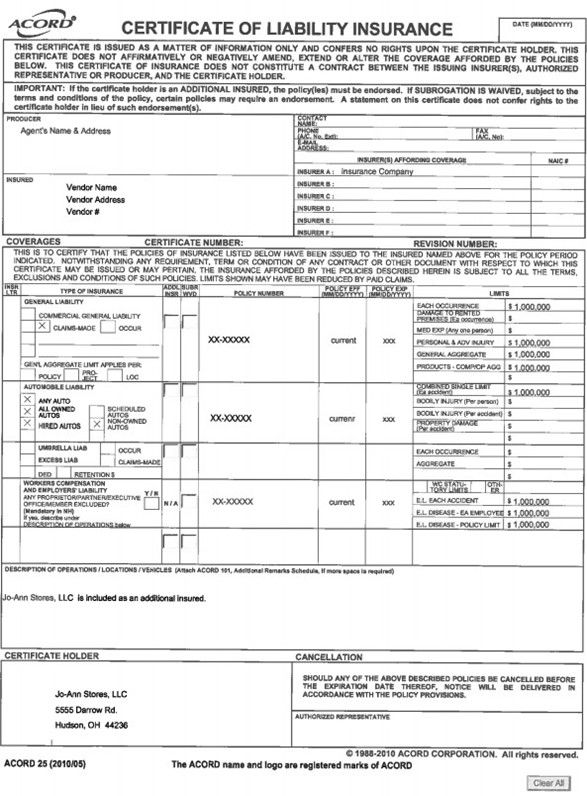 - An example of a Certificate of Insurance is in Appendix A.